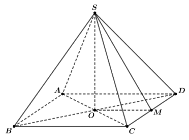 Cho hình chóp tứ giác đều S.ABCD có góc giữa cạnh bên với đáy một góc \({45^0}\). Tính cosin của góc giữa mặt bên và đáy của hình chóp đã cho.
