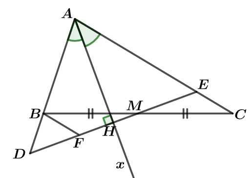 Cho \(\Delta ABC{\mkern 1mu} \left( {AB < AC} \right).\) Gọi Ax là tia phân giác của góc A. Qua trung điểm M của BC kẻ đường thẳng vuông góc với Ax, cắt các đường thẳng AB, AC lần lượt tại D và E. Chứng minh \(\angle ADE = \angle AED\)
