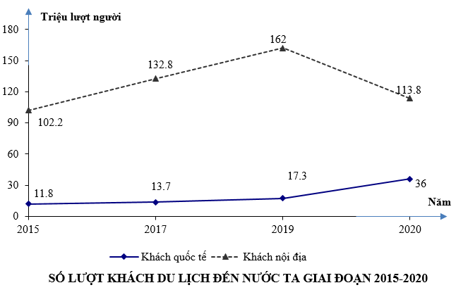 Cho biểu đồ về khách du lịch đến nước ta giai đoạn 2015-2020