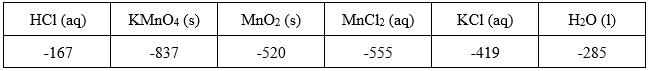 16HCl (aq) + 2KMnO4 (s) ⟶ 2MnCl2 (aq) + 2KCl (aq) + 5Cl2 (g) + 8H2O (l) (1)