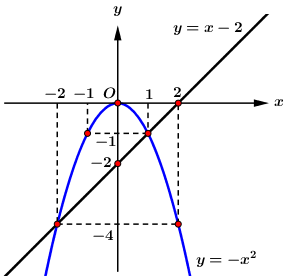 a) Vẽ đồ thị các hàm số \(y = - {x^2}\) và \(y = x - 2\) trên cùng mặt phẳng tọa độ Oxy.