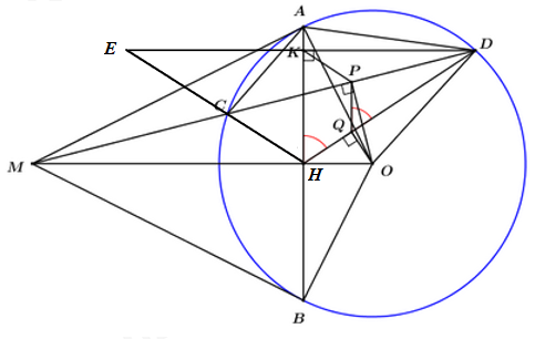 3) Gọi H là giao điểm của OM và AB. Kẻ DK vuông góc với AB tại K, OP vuông góc với CD tại P, OQ vuông góc với HD tại Q. Chứng minh tứ giác HKPQ là hình thang cân.