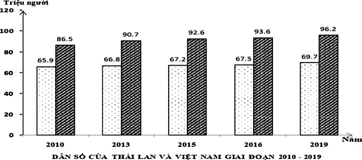 Theo biểu đồ, nhận xét nào sau đây đúng khi so sánh dân số của Thái Lan và Việt Nam giai đoạn 2010 đến 2019?
