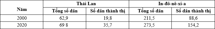 Cho bảng số liệu:TỔNG SỐ DÂN, SỐ DÂN THÀNH THỊ CỦA THÁI LAN VÀ IN-ĐÔ-NÊ-XI-A NĂM 2000 VÀ NĂM