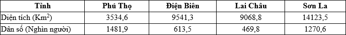 Theo bảng số liệu, để thể hiện quy mô diện tích và dân số của một số tỉnh năm 2020,dạng biểu đồ nào sau đây là thích hợp nhất?