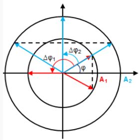 Tại t = 0: khoảng cách hai điểm sáng: \(d = {x_2} - {x_1} = {A_2}\cos \varphi - {A_1}\cos \varphi \)