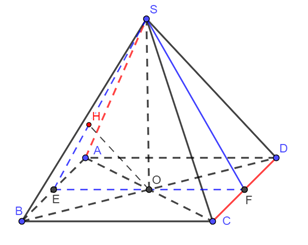 Cho hình chóp tứ giác đều \(S.ABCD\) có góc giữa hai mặt phẳng \(\left( {SAB} \right)\) và \(\left( {SCD} \right)\) bằng \({60^0}\) và khoảng cách giữa hai đường thẳng \(SA\) và \(CD\) bằng \(a\). Tính thể tích \(V\) của khối chóp \(S.ABCD\) theo \(a\).