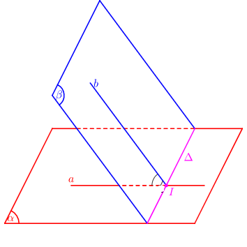 - Góc giữa hai mặt phẳng \(\left( \alpha \right),\,\,\left( \beta \right)\): \(\left( {\widehat {\left( \alpha \right);\left( \beta \right)}} \right) = \left( {\widehat {a;b}} \right)\)