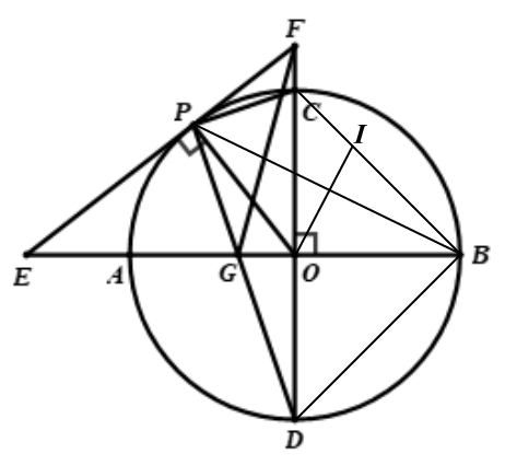 Cho đường tròn tâm O, bán kính R có hai đường kính AB và CD vuông góc với nhau. Một điểm P di chuyển trên cung nhỏ AC cắt đường tròn (O) (P khác A, C). Tiếp tuyến tại P của đường tròn (O) cắt các đường thẳng AB, CD lần lượt tại E, F. Nối DP cắt AB tại G.