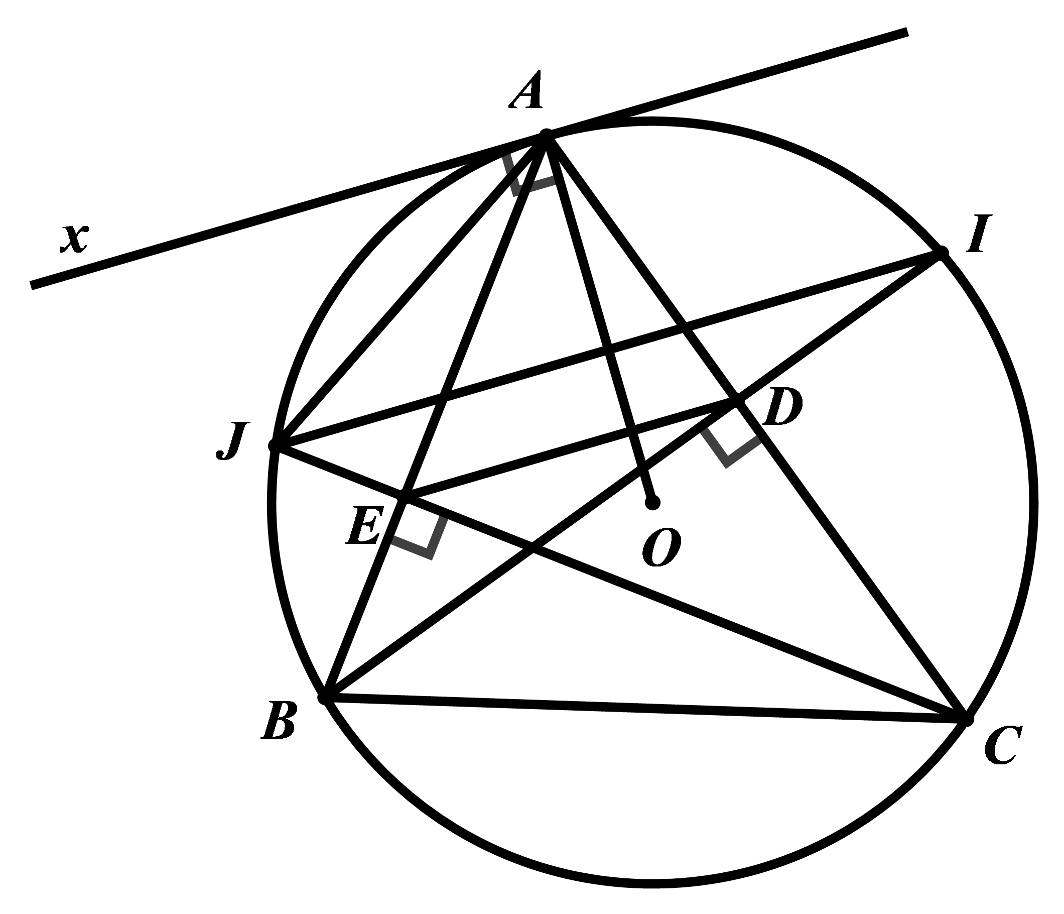 Chứng minh \(\angle IAx = \angle AJI\) từ đó suy ra Ax//IJ mà DE//IJ nên DE//Ax