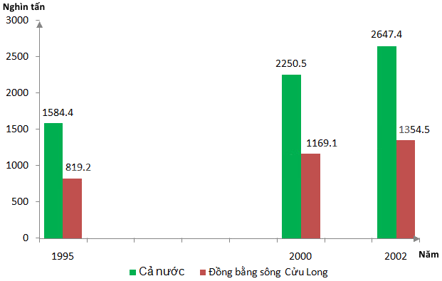 Vẽ biểu đồ cột thể hiện sản lượng thủy sản ở Đồng bằng sông Cửu Long và cả nước. Nêu nhận xét.