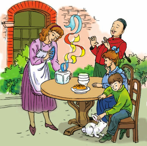 4. Mẹ mời chú Lý uống trà. Chú nhận lời. Nhưng từ lúc chú ngồi vào bàn, cả nhà cứ chứng kiến hết bất ngờ này đến bất ngờ khác. Xô-phi lấy một cái bánh, đến lúc đặt vào đĩa lại thành hai cái. Khi mẹ mở nắp lọ đường, có hàng mét dải băng đỏ, xanh, vàng bắn ra. Còn Mác đang ngồi bỗng cảm thấy có một khối nóng mềm trên chân. Hóa ra đó là một chú thỏ trắng mắt hồng.