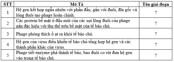 b. Hãy cho biết tên mỗi giai đoạn trong quá trình nhân lên của phage trong tế bào chủ được mô tả sau: