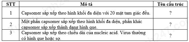 a. Dựa vào đặc điểm hình thái, người ta chia hạt virus thành 3 loại cấu trúc: xoắn, khối và hỗn hợp. Hãy cho biết tên cấu trúc của mỗi loại virus mô tả ở bảng sau:
