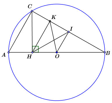 Cho đường tròn \((O)\) có đường kinh \(AB = 2\sqrt {2022} \). Lấy điểm \(C\) trên \((O)\) sao cho \(AC < BC\). Gọi \(H\) là hình chiếu vuông góc của \(C\) trên \(AB\) (H khác \(A)\). Kẻ H K vuông góc BC tại \(K\). Tính \(H{K^2} + O{K^2}\).