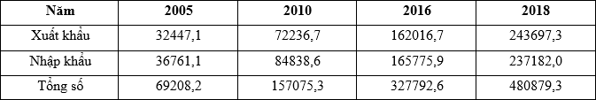 Cho bảng số liệu:GIÁ TRỊ XUẤT NHẬP KHẨU HÀNG HÓA CỦA NƯỚC TA GIAI ĐOẠN 2005 – 2018(Đơn