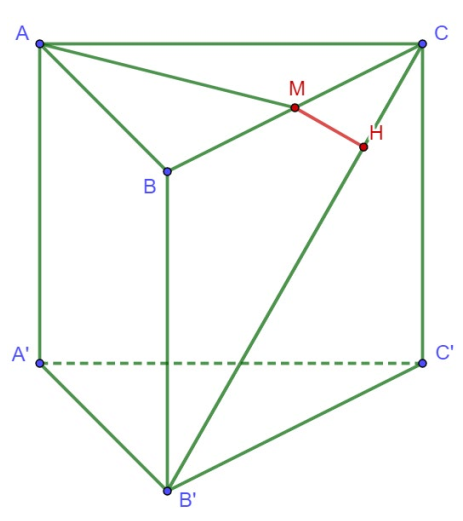 Cho hình lăng trụ đứng ABC.A’B’C’ có đáy ABC là tam giác vuông cân tại A, AB = a, \(AA' = a\sqrt 2 \). Gọi M là trung điểm BC. Khoảng cách giữa hai đường thẳng AM và B’C bằng: