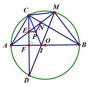 d) Gọi \(I\) là giao điểm của hai đường thẳng \(MD\) và \(AB\), \(N\) là giao điểm của hai đường thẳng \(AM\) và \(BC\). Chứng minh tâm đường tròn ngoại tiếp tam giác \(CEN\) nằm trên đường thẳng \(CI\).