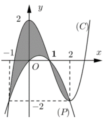 Hình phẳng (H) được giới hạn bởi đồ thị (C) của hàm đa thức bậc ba và parabol (P) có trục đối xứng vuông góc với trục hoành. Phần tô đậm của hình vẽ có diện tích bằng