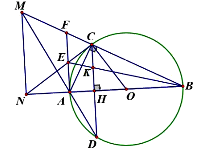 Cho đường tròn \(\left( O \right)\) đường kính \(AB\). Gọi \(H\) là điểm thuộc đoạn thẳng \(AO\left( {H \ne A,H \ne O} \right)\). Qua \(H\) vẽ đường thẳng vuông góc với \(AB\), đường thẳng này cắt đường tròn \(\left( O \right)\) tại \(C\) và \(D\). Hai đường thẳng \(BC\) và \(AD\) cắt nhau tại \(M\). Gọi \(N\) là hình chiếu của \(M\) trên đường thẳng \(AB\).