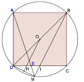 Cho hình vuông \(ABCD\) nội tiếp đường tròn \(\left( {O;R} \right)\), trên dây cung \(DC\) lấy điểm \(E\) sao cho \(DC = 3DE\), đường thẳng \(AE\) cắt cung nhỏ \(DC\) tại \(M\). Gọi \(I\) là giao điểm của \(BM\) và \(DC\), vẽ \(OH\) vuông góc với \(DM\) tại \(H\). Tính độ dài các đoạn thẳng \(AE\) và \(DI\) theo \(R\).