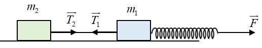 Trên mặt phẳng nhẵn nằm ngang có hai vật, \({m_1} = 1\,\,kg\) và \({m_2} = 2\,\,kg\), được nối với nhau bởi một sợi dây. Hai vật bị kéo theo phương ngang thông qua một lò xo có khối lượng không đáng kể, lò xo nối với vật \({m_1}\). Lò xo bị dãn ra một đoạn x = 2 cm. Độ cứng của lò xo k = 300 N/m. Hãy xác định gia tốc của hai vật.
