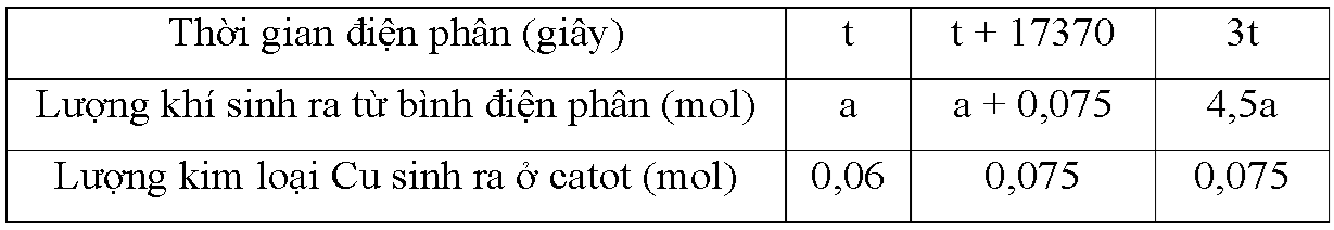 Dung dịch X gồm CuSO4 và NaCl. Tiến hành điện phân dung dịch X với điện cực trơ, màng ngăn xốp, cường độ dòng điện 0,5A, hiệu suất điện phân là 100%. Lượng khí sinh ra từ bình điện phân và lượng kim loại Cu sinh ra ở catot theo thời gian điện phân được cho ở bảng sau: