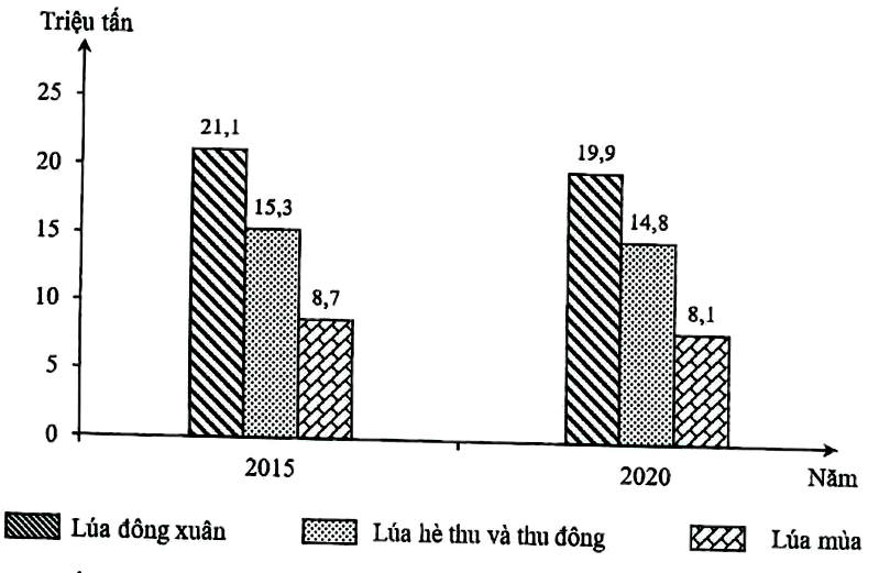 Cho biểu đồ về sản lượng các vụ lúa của nước ta năm 2015 và năm 2020: