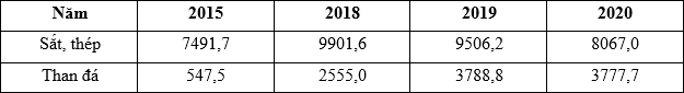 Cho bảng số liệu:TRỊ GIÁ MỘT SỐ MẶT HÀNG NHẬP KHÂU CỦA NƯỚC TA GIAI ĐOẠN 2015 - 2020(Đơn
