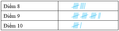 Số lượng điểm 8, 9, 10 của học sinh lớp 3A trong bài kiểm tra giữa kì môn Toán được ghi lại như sau: