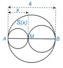 Xét đường tròn đường kính AB = 4 và một điểm M di chuyển trên đoạn AB, đặt AM = x. Xét hai đường tròn đường kính AM và MB. Kí hiệu S(x) là diện tích phần hình phẳng nằm trong hình tròn lớn và nằm ngoài hai hình tròn nhỏ. Xác định các giá trị của x để diện tích S(x) không vượt quá một nửa tổng diện tích hai hình tròn nhỏ.