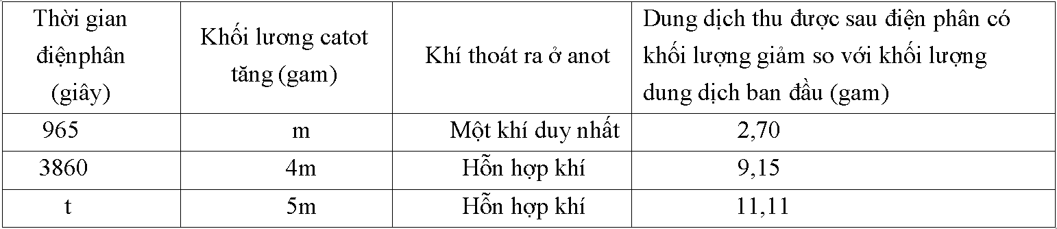 Tiến hành điện phân dung dịch gồm CuSO4 và NaCl (điện cực trơ, màng ngăn xốp, hiệu suất điện phân 100%, bỏ qua sự hòa tan các khí trong nước và sự bay hơi của nước) với cường độ dòng điện không đổi. Kết quả của thí nghiệm cho ở bảng sau: