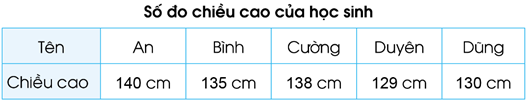 Quan sát bảng, tìm bạn cao hơn 135 cm và thấp hơn 140 cm.