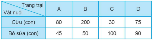 Cho bảng số liệu về số vật nuôi của 4 trang trại.