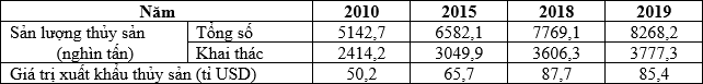 Căn cứ bảng số liệu, cho biết nhận xét nào sau đây đúng về tình hình phát triển thủy sản ở nước ta giai đoạn 2010 - 2019?
