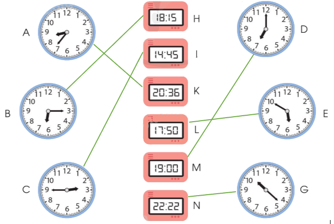 Lấy số giờ trên đồng hồ số trừ đi 12. Sau đó nối hai đồng hồ chỉ cùng giờ.