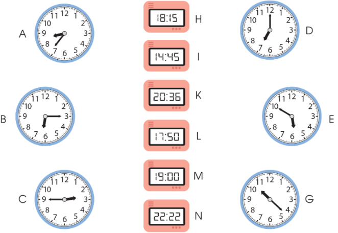 Hai đồng hồ nào dưới đây chỉ cùng một thời gian vào buổi chiều hoặc buổi tối?