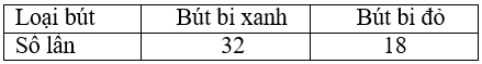b) Trong một hộp có một số bút bi xanh và một số bút bi đỏ. Lấy ngẫu nhiên một chiếc bút từ hộp xem màu rồi trả lại vào hộp. Lặp lại hoạt động trên 50 lần, ta được kết quả như sau: