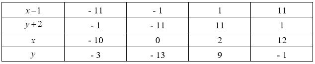 Tìm \(x,y \in \mathbb{Z}\)biết: \(\left( {x - 1} \right).\left( {y + 2} \right) = 11.\)