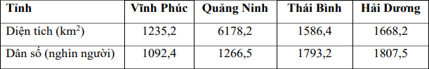 Cho bảng số liệu:DIỆN TÍCH VÀ DÂN SỐ MỘT SỐ TỈNH NĂM 2018(Nguồn: Niên giám thống kê Việt