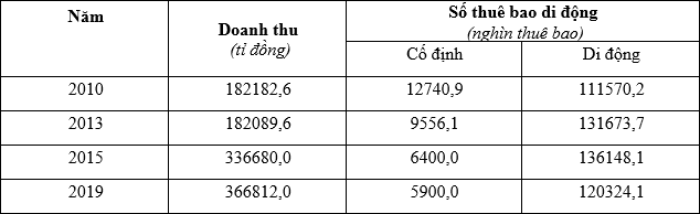 Cho bảng số liệu: TÌNH HÌNH PHÁT TRIỂN NGÀNH BƯU CHÍNH VIỄN THÔNG NƯỚC TA, GIAI ĐOẠN 2010 -
