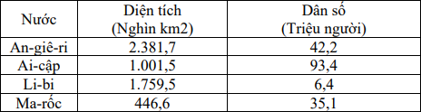 Cho bảng số liệu sau: DIỆN TÍCH VÀ DÂN SỐ NĂM 2017 CỦA MỘT SỐ QUỐC GIA (Nguồn số liệu theo