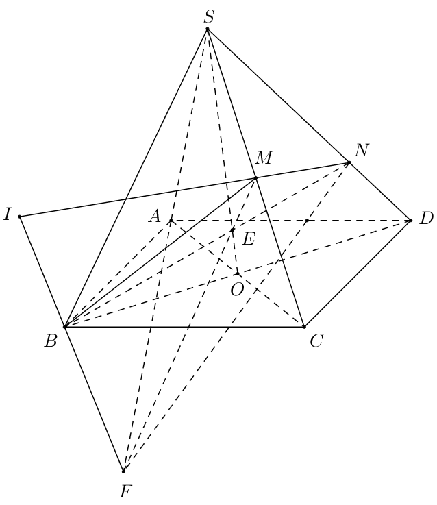 Cho hình chóp S.ABCD, có ABCD là hình bình hành. Gọi M là trung điểm SC, N là điểm thuộc SD (N không là trung điểm). Gọi O là giao điểm 2 đường chéo.