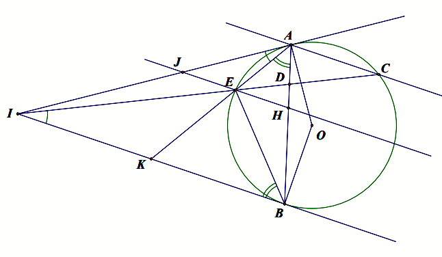b) Qua \(A\) kẻ đường thẳng song song với \(IB\) cắt đường tròn \(\left( O \right)\)tại điểm thứ hai là \(C\) (\(C\) khác \(A\)). Đường thẳng \(IC\) cắt đường tròn \(\left( O \right)\)tại điểm thứ hai là \(E\) (\(E\) khác \(C\)). Đường thẳng \(AE\) cắt \(IB\) tại \(K\). Chứng minh \(K{B^2} = AK.KE\)