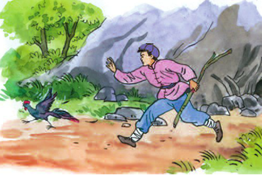 3. Đắn đo một lúc, Gà Rừng nghĩ ra một mẹo, ghé tai Chồn: