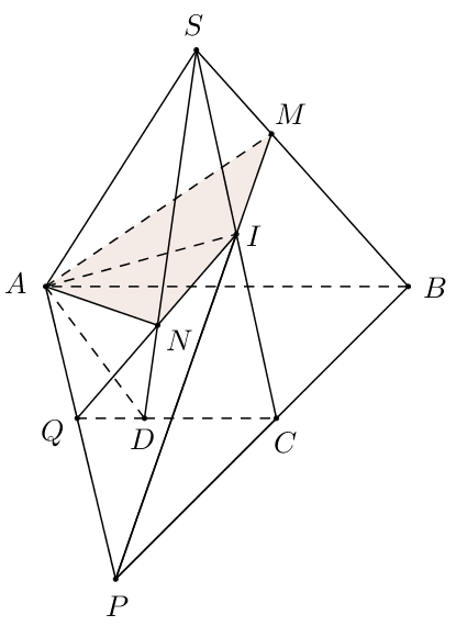Cho hình chóp S.ABCD có đáy ABCD là hình thang đáy lớn là AB, I là trung điểm SC. Một mặt phẳng (P) qua AI và cắt SB, SD lần lượt tại M, N; IM cắt BC tại P , IN cắt CD tại Q.