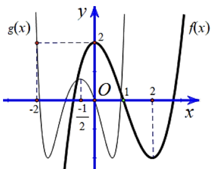 Cho hàm số bậc ba y = f(x) có y = f ( x) đồ thị là đường cong đậm trong hình vẽ và đồ thị hàm số \(g\left( x \right) = f\left( {a{x^2} + bx + c} \right)\) với \(a,b,c \in \mathbb{Q}\) có đồ thị là đường cong mảnh như hình vẽ. Đồ thị hàm số y = g(x) có trục đối xứng là đường thẳn \(x = - \dfrac{1}{2}\). Tìm giá trị lớn nhất của hàm số g(x) trên đoạn [-2;2].