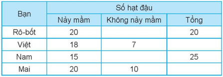 Các bạn Rô-bốt, Việt, Nam và Mai đã gieo một số hạt đậu để quan sát sự nảy mầm của hạt. Số liệu về số hạt nảy mầm và không nảy mầm của một bạn được ghi lại trong bảng sau: