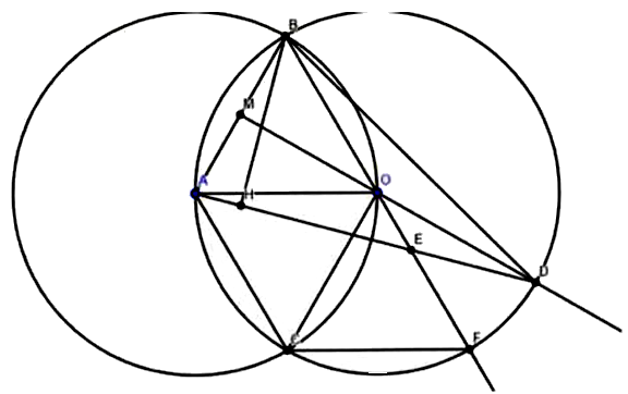 Cho đường tròn \(\left( O \right)\) bán kính \(R\) và điểm \(A\) nằm trên đường tròn. Đường tròn \(\left( {A;R} \right)\) cắt đường tròn \(\left( O \right)\) tại hai điểm \(B\) và \(C\). Gọi \(M\) là trung điểm của \(AB\), tia \(MO\) cắt \(\left( O \right)\) tại điểm \(D\). Tia \(BO\) cắt \(AD\) tại \(E\) và \(\left( O \right)\) tại điểm thứ hai là \(F\). Tính độ dài đoạn thẳng \(DE\) và diện tích tứ giác \(ACFE\) theo \(R\).