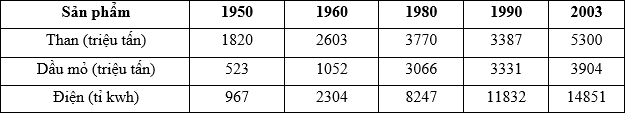 Cho bảng số liệu sau: TÌNH HÌNH SẢN XUẤT MỘT SỐ SẢN PHẨM CÔNG NGHIỆP CỦA THẾ GIỚI GIAI